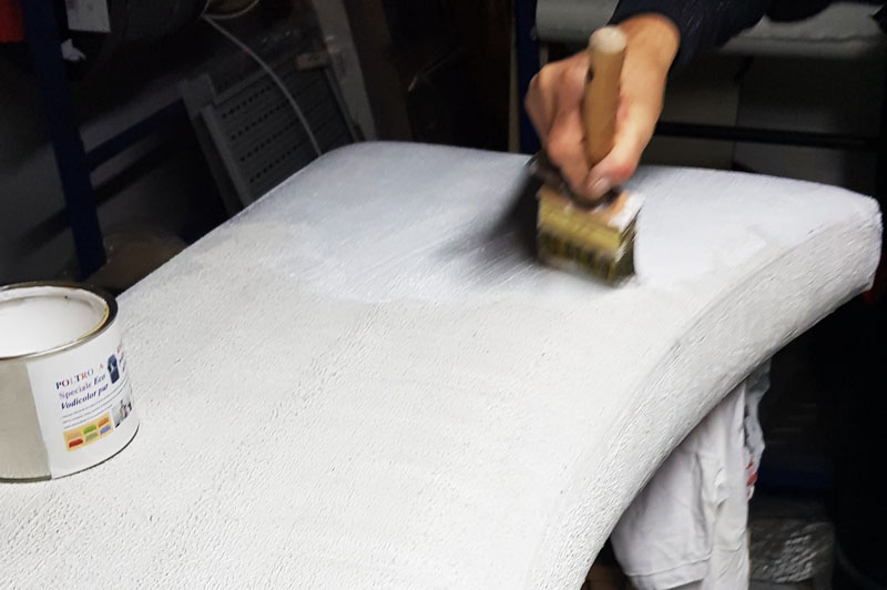 Premettendo che il prodotto può essere applicato con pennello, rullo a pelo corto o macchinari AIRLESS, a seconda della propria disponibilità, veniamo alle fasi successive. Dopo aver eseguito le azioni precedentemente indicate, è giunto il momento di applicare il prodotto Rigener Special Ecopelle-pelle CASA solo sulle zone più rovinate, lasciandolo poi riposare per almeno 5 ore, per poi modellarlo con un pezzo di carta abrasiva.